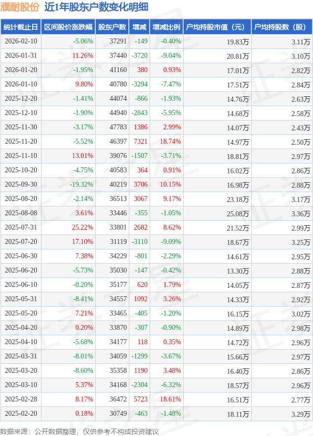 濮耐股份低于行业平均程度。从股价来看,减幅为0.4%。户均持股数量由上期的3.1万股添加至3.11万股,2026年1月31日至2026年2月10日,户均持股市值方面,